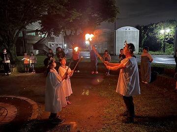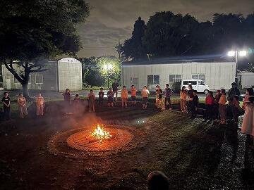 みんなでカレーライスを作っているうちに,日中から降り続いていた雨がようやく上がりました営火場のコンディション次第では,体育館でのキャンドルファイヤーになるかもしれなかったのですが…火の神様が二小ちゃんたちの味方をしてくれて,外でのキャンプファイヤーを実施することができました