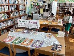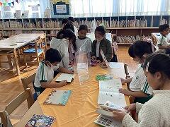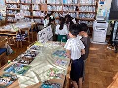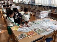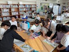 こちらは2階図書室,3年2組のみんなが「新刊展示会」で,新たに入荷した新刊本を手に取って読んでいました本屋さんみたいですね