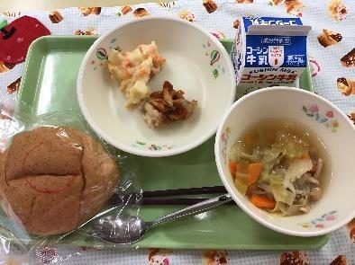今日は,胚芽パン・とりにくのトマトソースかけ・じゃがいもチーズに・