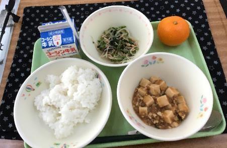 今日は,マーボー豆腐・小松菜入りはるさめサラダ・みかんでした!