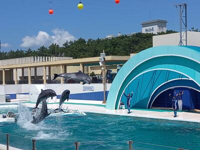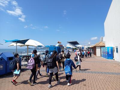 鴨川シーワルドに着きました。晴天の土曜日なので、一般のお客さんもたくさんいます。