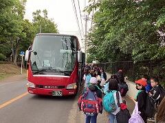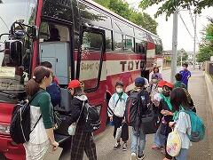 5年生が林間学校出発の会を終えて,元気に大津二小を出発しました午前中は茨城県の栽培漁業センターで見学をして,鹿島港公園でお弁当を食べたら,柏市に戻ってきて「手賀の丘青少年自然の家」での活動となります。