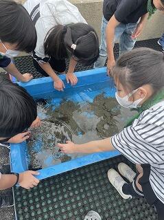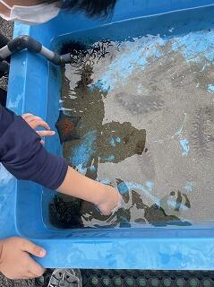 茨城県鹿嶋市の栽培漁業センターで,ヒラメやアワビの栽培漁業について学習しました。その後にヒトデ・ヒラメ・ナマコと触れ合いました。水槽にこわばった表情で手を入れる二小ちゃんたち…初めての感触ですかね