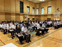 11時からは風早南部小の体育館へ移動して,風早中学校区(風早中・風早南部小・大津二小)3校合同で教職員の不祥事根絶研修会を開催しました。不祥事を起こさないために,よりよい職場風土を教職員チームでつくっていくことの大切さを学び,風早中学校区の教職員62名で改めて気持ちを引き締めました。