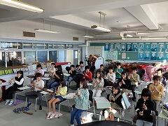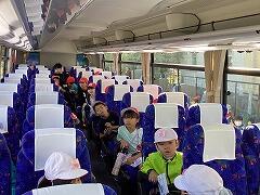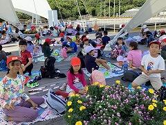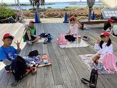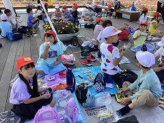 テントデッキで海風を感じながらのお弁当タイムは,とても気持ちよかったです。おうちの方々が用意してくださった美味しいお弁当と,子どもたちが準備したおやつで“チャージ”して,帰途へつきました。道路が順調で予定よりも早く学校に到着できたので,実行委員さんへねぎらいの拍手を贈りました。