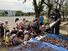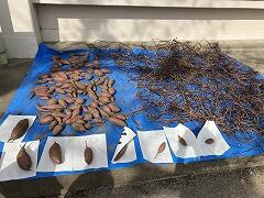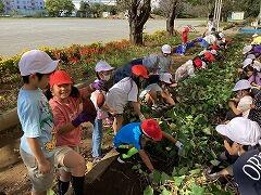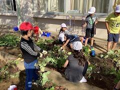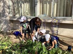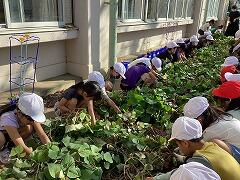 2年生は生活科の学習で植えたサツマイモを収穫しました。1年生教室前の花壇に,よく育ったサツマイモのつるをつたって土の中を掘ってみると,大小さまざまなサイズのサツマイモを見つけました。丁寧に掘り出して無事に収穫「実りの秋」ですね~