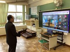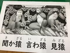オンラインで11月の全校集会を行いました。校内放送で流れる校歌をみんなで元気に歌った後,家庭科作品展の表彰と後期分の学級委員任命式を見守り,飯田校長先生のお話をしっかりと聞きました。日光東照宮にある「三猿」,日々の生活でよくないことは「見ざる・聞かざる・言わざる」にして,よいことを「見て・聞いて・言って」にしていきましょう
