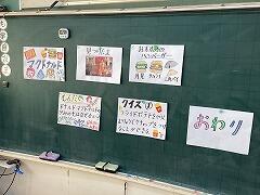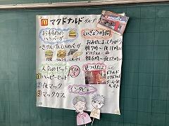 4時間目,2年生では先日の町たんけん(vol.132 参照)で学習してきたことを紙芝居かポスターにまとめて発表するための準備をしました。担任の先生が作成した見本(※ハンバーガー店には行っていません,念のため