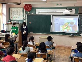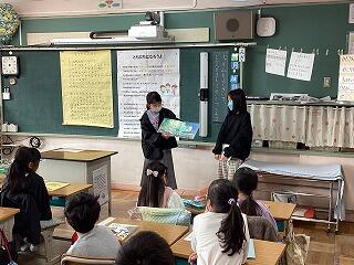 5年生で柏市の「子ども司書講座」を受講している児童が,講座内の活動として1年生に絵本の読み聞かせを行いました本が大好きな“未来の”子ども司書さん,絵本に興味を持ってもらうために実物投影機を使用して絵本を映し出したり,より感情を込めて読んだりと,工夫や努力が1年生のみんなに伝わったと思います