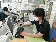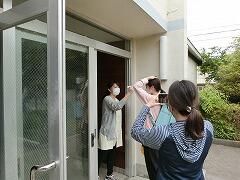 6月8日の1年生の「にこちゃんミーティング」に備えて,事務の染谷さんと空先生がzoomの機能や接続対応の仕方を試しています。