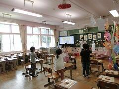 1年生もピンとした姿勢で先生のお話を聞いていました。後ろ姿が立派でしたよ。大津先生と楽しそうにじゃんけん大会もしていました。