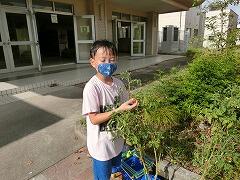 3年生の花壇のひまわりとほうせんかが,すくすくと伸びています。今日は,その様子を観察していました。近くに行くと,3年生はいつもいろいろと話をしてくれます。「ヒマワリの花は太陽の方を向くんだよ。」「ほうせんかの花の色はうす紫もあるんだよ。」と今日も嬉しそうに教えてくれました。