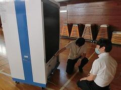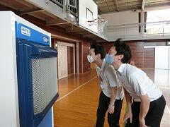 体育館に冷風機が届きました。これで,灼熱の太陽を避け,体育館で体を動かすことができます。