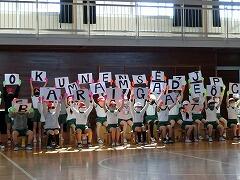 体育館のくす玉には,「今まで支えてくれてありがとうございました。中学校でもがんばります!」と書かれていました。代表で発表してくれたお母さんが,内容を読みあげると,会場から大きな拍手が起こりました。そして,帰り際にたくさんのお家の方がくす玉の写真を撮って帰っていきました。