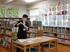 グループごとに選んだ昔話を発表していました。昔ばなしなので,言い回しがちょっと違います。しかし,よーく練習をしてあるので,みんなすらすらと音読することができました。発表者は,飛沫飛散防止のフイルムの中で音読していました。