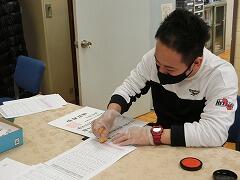 卒業証書の割り印を押しています。卒業生台帳と卒業証書と合わせて押します。