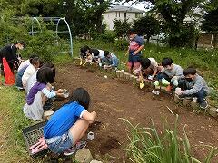 4年生が,ツルレイシの種を牛乳パックで作ったミニ植木鉢に種を植えました。芽が出て少し育ったら,校庭の花壇に植え替えます。緑のカーテンを作りながら,成長の様子を観察していきます。