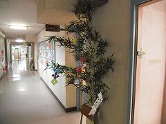 1年生の廊下に笹の葉が飾られました。折り紙で素敵な模様をつけています。