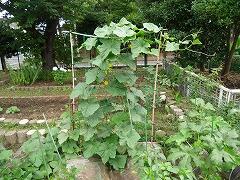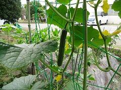 特にきゅうりの成長は著しく・・・。裏にまわると,こんなに立派な実ができていました。