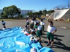 今日は,1・2年生のスポーツデーでした。他の学年は先週,開催できたのですが,1・2年生だけ雨で延期となりました。ところが…昨日の夜中に雨が降ってしまい,校庭はぐちゃぐちゃに…。そこで,先生達や6年生が朝早くから雨水を吸い取ったり,土を埋めたりしてグラウンド整備をしてくれました。おかげで,1・2年生は無事にスポーツデーを開催することができました。