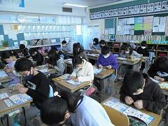 感染が落ち着いてから,やっとみんなで合唱ができるようになりました。校舎の中に,子ども達の歌声が響くこと・音楽が流れることって,とても素敵なことなんだなぁとつくづく感じます。音楽室では3年生が気持ちよさそうに合唱していました。音楽専科の杉橋先生の指揮に合わせて体を動かしたり,指揮をまねてみたり…。マスクをつけてはいますが,笑顔があふれていました。