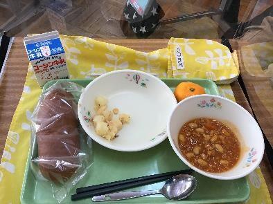 今日は,黒糖パン・チリコンカーン・ジャーマンポテト・みかんでした!