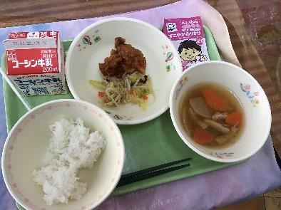 今日は,とりにくのからあげ・はるさめサラダ・ごもくじる・おかかふりかけ