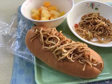 今日は,やきそばパン・ポークビーンズ・フルーツ和えでした!