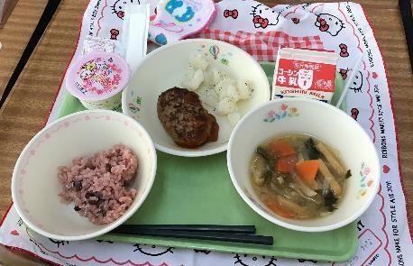 赤飯・ハンバーグきのこソース・こふきいも・お祝いいちごゼリーでした!
