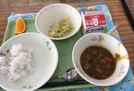 まめいりチキンカレー・キャベツとコーンのサラダ・いよかんでした!