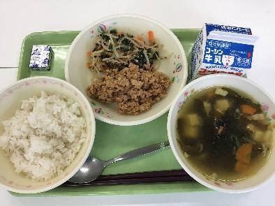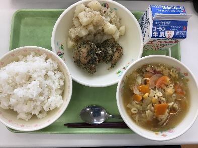 今日は,ししゃものからあげ・のりあえ・新玉ねぎとじゃがいものみそ汁・黒糖大豆でした!