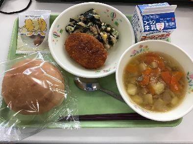 今日は,まるパン・野菜コロッケ・春キャベツとツナのサラダ・しんにんじんのスープ・