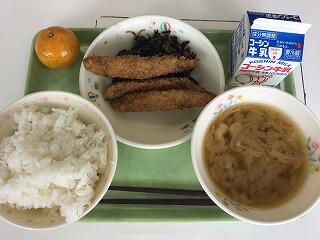 今日は,ししゃものいそべあげ・ひじきのごもくに・たまねぎとじゃがいもの味噌汁・