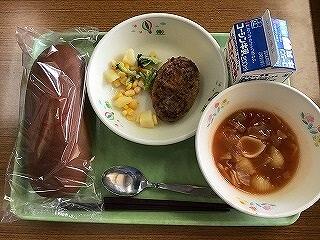 今日は,黒糖パン・ハンバーグBBQソースかけ・ブロッコリーとポテトのサラダ・
