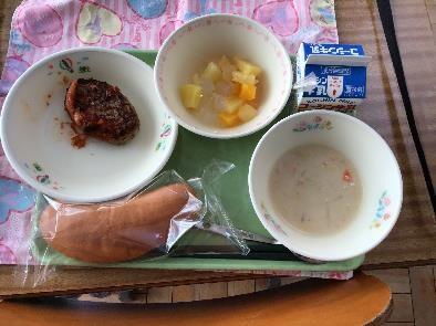 今日は,コッペパン・ハンバーグのトマトソースかけ・白菜の米粉シチュー・
