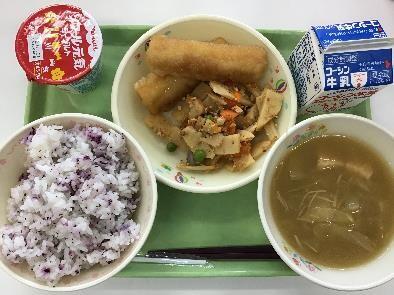 今日は,いかのかりんあげ・たけのこのおかかに・ゆかりご飯・はるキャベツのみそ汁・