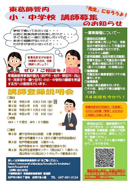 教員免許状を取得済みで東葛飾管内の講師登録を希望する方を対象に、講師登録説明会を実施します。説明会では、講師の仕事の概要や待遇、登録方法について説明します。話だけでも聞いてみたいという方、ふるってご参加ください。