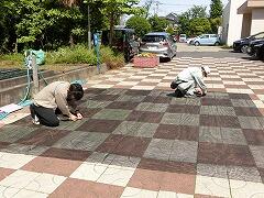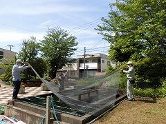 朝の雨とはうって変わって,昼間はまるで真夏のような晴天になりました。事務の染谷さん,用務員の竹内さんと理科支援員の石田さんが,古くなった池の防護ネットの張替をしてくれました。これで鯉たちは,カラスから守られます。