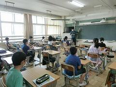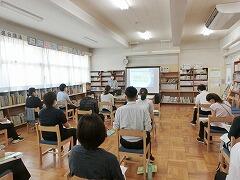 子ども達が帰った後,いつも先生達は掃除と消毒を行います。今日は,その後に柏市教育委員会指導課の笹間先生に来ていただき,校内研修を行いました。体育館で行う予定でしたが,あまりにも暑いので図書室で行いました。間隔を空けるために,机が置けず膝の上で一生懸命にメモを取りながらお話を伺いました。