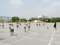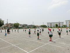ソーシャルディスタンスをとるためでした。赤いお手玉をポイントにおいて,「赤いお手玉が自分のつま先にくるように立ってごらん。」と指示されるとさっと移動していました。お天気がとてもよかったので,こまめに休憩をとりながら,水分を補給しながら行っていました。体育の時間は,子ども達はマスクを外して行いますが,先生達はマスクをして授業を行います。