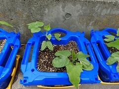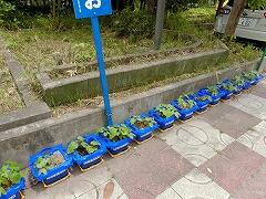 1年生のアサガオが,ぐんぐんと伸びてきました。池のまわりに少しずつみんなの鉢もそろってきました。