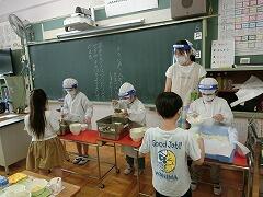 1年生は初めての給食でした。しばらくの間は,先生達で配膳します。自分の分をもらうと,嬉しそうにいただきますを待っていました。野菜がはいった和え物もたくさん食べて「おいしかったよ。お腹いっぱいになった。」と教えてくれました。