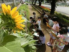 3年生の花壇のひまわりとほうせんかが,すくすくと伸びています。今日は,その様子を観察していました。近くに行くと,3年生はいつもいろいろと話をしてくれます。「ヒマワリの花は太陽の方を向くんだよ。」「ほうせんかの花の色はうす紫もあるんだよ。」と今日も嬉しそうに教えてくれました。