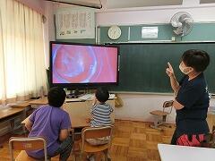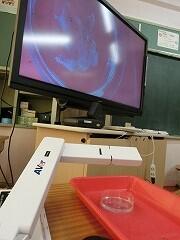 実物投影機をテレビ画面に1日つないで観察していました。ずっと見ていてもなかなか生まれる様子はありません。実物投影機で見ると,たまごの中で動いている様子も見えます。あきらめて,次の時間に見に行くと…。赤ちゃんメダカが1匹増えている…。
