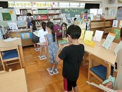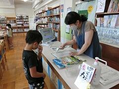 夏休み前の本の貸し出しを行っています。一人3冊までかりられるので,じっくりとえらんで,図書館支援員の森先生に貸し出しをしてもらっています。