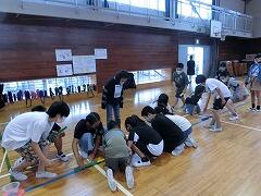 床に並べる作戦を考えたグループもありました。2回目の1グループだけ1つ成功!2回目の作戦タイム。みんな床おき作戦をするのかと思いましたが,自分たちのやり方を貫くグループもありました。