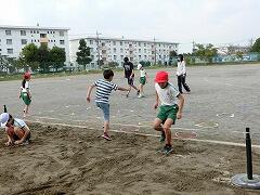 今日は,走り幅跳びを学習していました。輪を使ってリズムよく助走し,ゴムひもを上手に跳びこえていました。