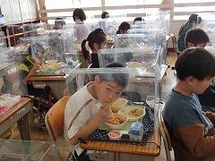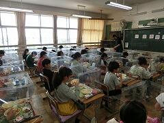 給食の時間はマスクを外すので,どのクラスも静かに食べています。飛沫防止シートも久しぶりでしたが,すぐに机にセットして配膳を始めていました。