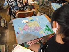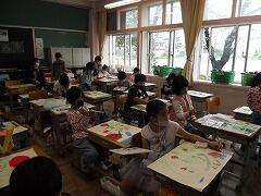 1学期に育てた野菜の絵をかいていました。りっぱなトマトやゴーヤが画用紙いっぱいに実っています。