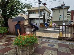 校門に入るところで,今朝,検温をしてきたかどうかを確認しています。